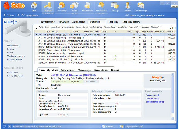 Sello umożliwia szybkie przygotowanie serii aukcji i śledzenie ich przebiegu. Pozwala lepiej kontrolować płatności od klientów i zarządzać komentarzami. Pomaga przygotować paczki i stworzyć dla nich odpowiednie druki.